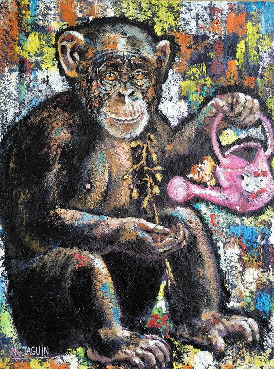 This work uses a monkey to symbolize humanity and its dark side. Nature is no longer a place of hope, but an illusion that man tries in vain to control. The watering can, far from being a toy, represents human folly and the desire to dominate. Ultimately, the painting expresses that life is an illusion that humanity cannot control.