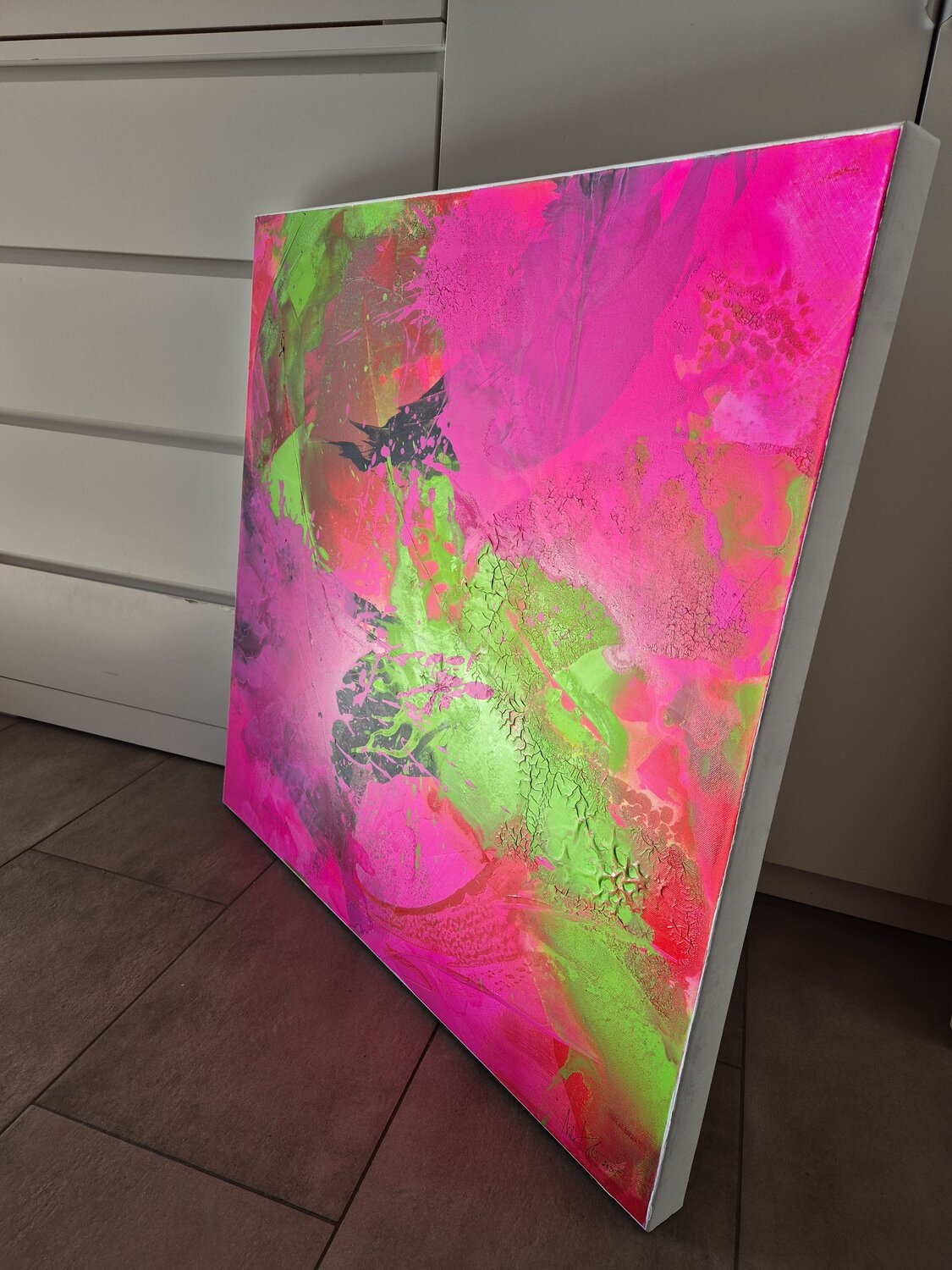 "Blooming" is an expressive abstract work of art in the style of action painting that captures the dynamism and liveliness of spring. With powerful brushstrokes and spontaneous color gradients, a lively interplay of green, pink, red and white unfolds.