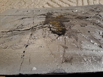 This piece consists of many superimposed layers of acrylic paint, silver spray, glue, and ink. Using a heat gun and other tools, I created a unique texture. Depending on the lighting conditions, the work takes on a slightly different hue. Because this series explores the theme of structure, this image, despite its limited color palette, gains its vibrancy through its distinctive surface.