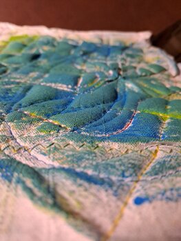 Next, I sewed a piece of fabric onto the pier and padded it with stuffing. I used different colors and stitch patterns for topstitching. Since it still looked a bit plain, I painted it with acrylic paint.