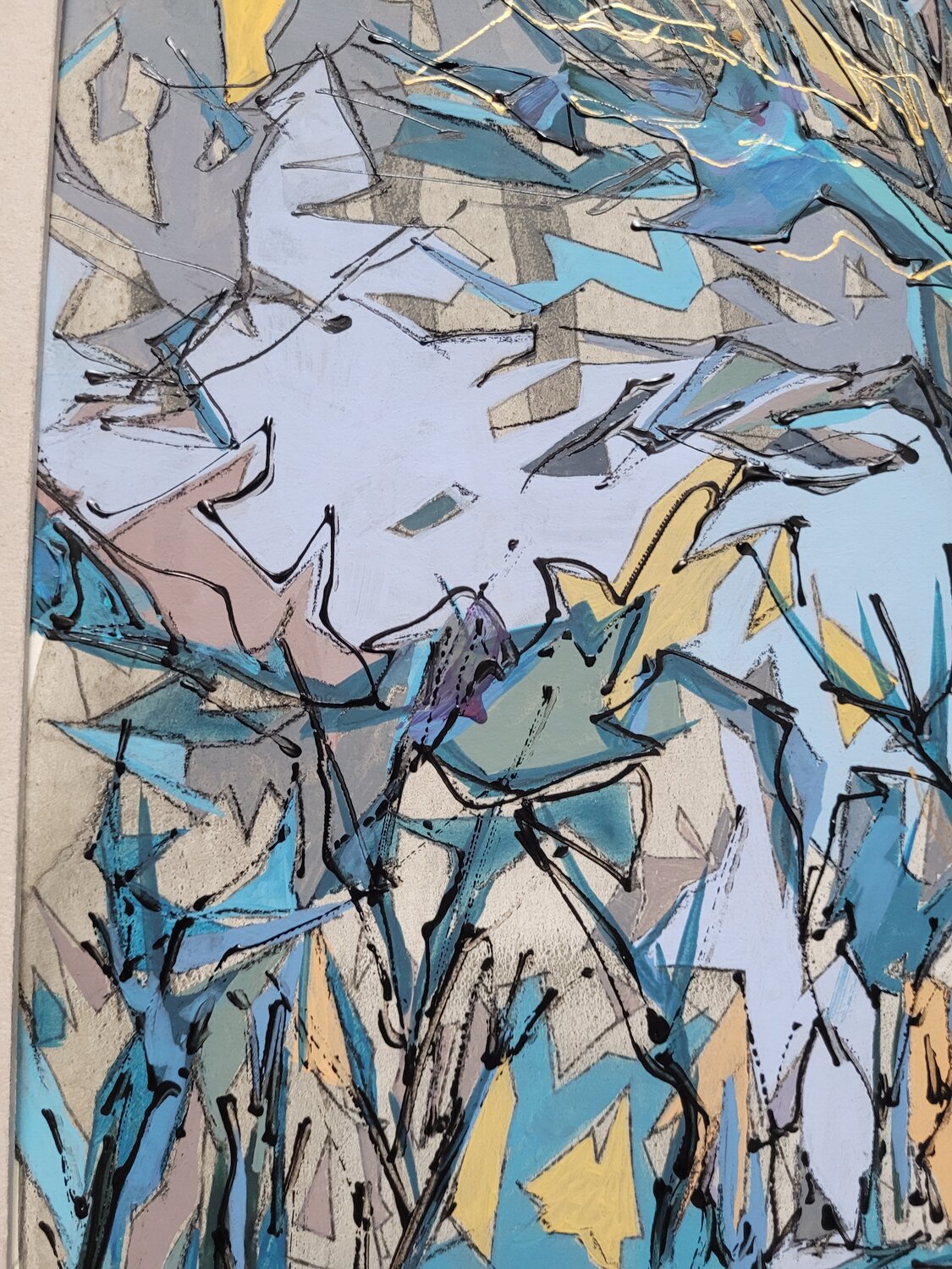 In this piece, I poured my passion for nature into bold geometric shapes, capturing the essence of trees bathed in cool blue light. The cubist influence fractures reality, inviting you to see the world anew—dynamic, alive, and layered. This work breathes calm energy and introspection, perfect for inspiring a serene yet vibrant atmosphere in your space. It’s a celebration of nature’s complex beauty through abstract harmony.
