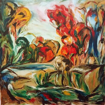 In this work, I captured the storm of emotions that the autumnal change arouses within me. The vivid colors and swirling movement express this inner strength, this passionate tumult. I wanted to convey the raw, almost wild energy of nature in full transformation. This painting will bring an intense vibration to your home, an invitation to feel and let yourself be carried away by the emotional flow.