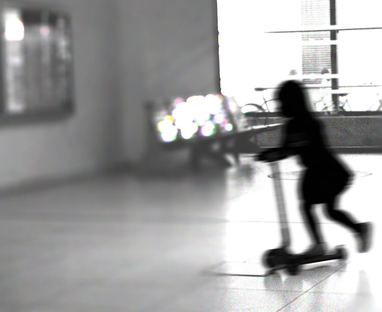 The trains didn't move, nor did the people. Time seemed to stand still. Only a girl in the station rode her scooter, stirring the thoughts of the people who weren't there.