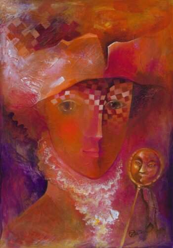 In this work, I fused acrylic, collage, and cotton to create a vibrant visual dialogue. Inspired by Fauvism and realism, I play with warm color contrasts and texture to reflect the complexity of human emotions. The partially veiled face evokes mystery, while the lunar companion symbolizes emotional constancy. Each element aspires to captivate, inspire, and enrich the living space with deep and colorful energy.