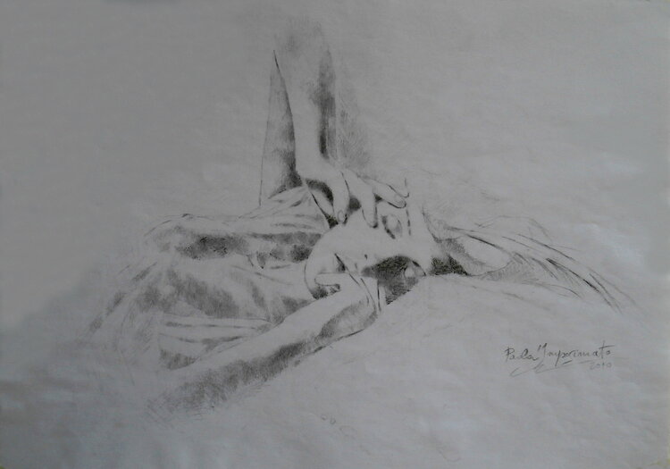 Drawing made in pencil and ink on paper that represents the moment in which a woman indulges in her night's rest. The numbness of the soul and body lull the fading of thoughts that permeate ordinary life to cross the threshold of the dream world.