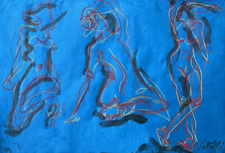 "Where there is woman, there is magic" (Ntozake Shange, poet) In this work done in pastels, on blue handmade Nepalese silk sheet, In this work, I sought to capture the energy and raw emotion through expressionism and figurative, using pastel and walnut stain. The vibrant blue background contrasts with the fluid and dynamic lines that depict the human forms, evoking freedom and movement. This creation is a tribute to the spontaneous beauty of the… moment, a visual dance that invites introspection and the celebration of life. This piece will bring a touch of emotional depth and captivating energy to any space.