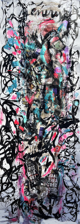 In this work, depicting Hurricane, I embraced the expressiveness of abstract movement and expressionism, using acrylic and collage to create an intense and captivating visual dialogue. Splashes of color and bold doodles capture the tumult of emotions, symbolizing inner struggle and the beauty of uncontrolled chaos. This canvas is a celebration of the resilient strength of the human spirit, offering a dynamic and inspiring energy to any space where… it is displayed. (with rod at the top with hook)