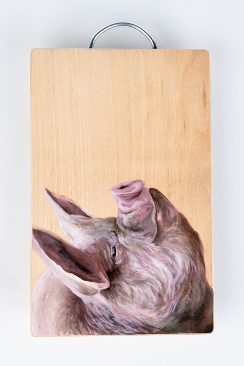 Fatum XV confronts us with the sweet unconsciousness of life. A little pig painted with delicate realism in oil on a butcher block, peers out into the world, oblivious to the fate that awaits him. His tender image, in pink and brown tones, contrasts with the support, creating a tension that invites us to reflect on our own existence and the way in which we cling to the illusions of everyday life to avoid the awareness of our mortality. This work… is a visual fable that reminds us of the ephemeral beauty of life.