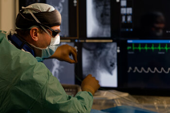 This image shows a neurosurgeon during an interventional procedure in which the actual action is controlled via screens. Direct contact with the body recedes into the background; orientation is achieved through visual information and technical systems.
