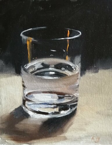 This still life of a simple glass of water was painted during the turbulent times of the Covid 19 pandemic. The word 'still' in the title carries a double meaning... non sparkling, calm amidst chaos, but also one of the few things which remain the same, and permanent.
