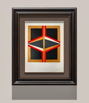 This artwork is a geometric composition featuring a striking contrast of four colors: dark gray, beige, red, and gold, which provide the accents for its significant visual impact. The arrangement of the forms creates a feeling of being observed, as if someone were watching us, hence its title, "Observer." The frame shown in the first image is a simulation of how a modern composition blends with a classic frame, creating a pleasingly eclectic effect.… The painting is delivered framed in white.