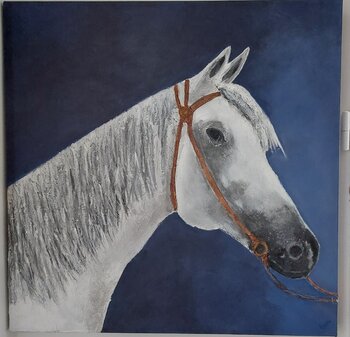 In this work, I sought to capture the majestic essence and tranquility of a white horse, a symbol of purity and freedom. Using acrylics and plaster to bring to life the silky texture and quiet strength of this animal, this painting invites reflection and serenity. My goal was to convey a sense of calm and nobility, incorporating shades of deep blue to accentuate the contemplative atmosphere. This art will bring an energy of peace and elegance to… any living space.