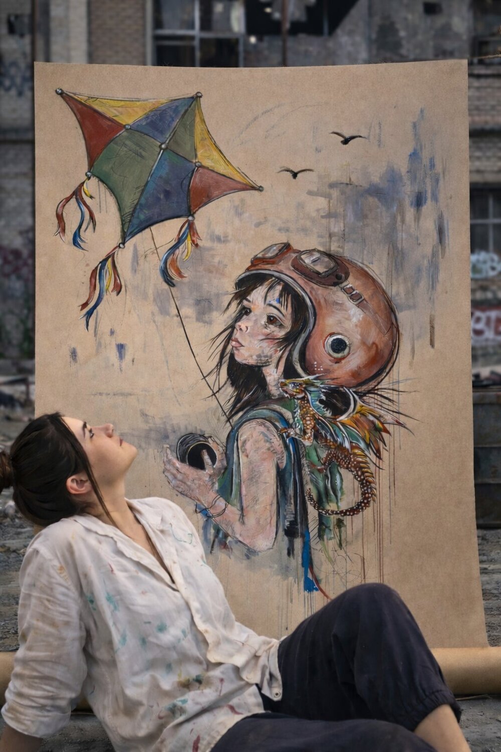 Her works are often created on raw cardboard and other unconventional supports. Traces of the material, folds, and cracks remain visible and become part of the narrative. Realistic figures meet expressive surfaces – oscillating between childlike directness, vulnerability, and inner strength.