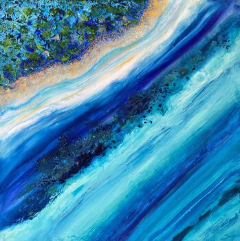 The relief associated with the powerful ultramarine blue that I used for this canvas gives the work a depth which, when confronted with the few finely golden details, amplifies its luminosity. With this painting which evokes the sea seen from the sky, I wanted to give a feeling of height.