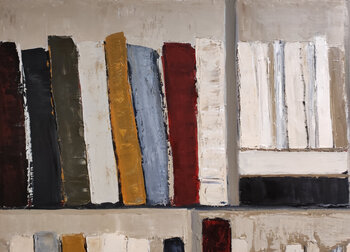 The palette, dominated by off-whites, blue-grays, deep browns, reds, and ochres,… gives the whole an atmosphere that is both sober and lived-in. The palette knife painting adds a vibrant, rhythmic texture, where each book seems to have its own weight and voice.