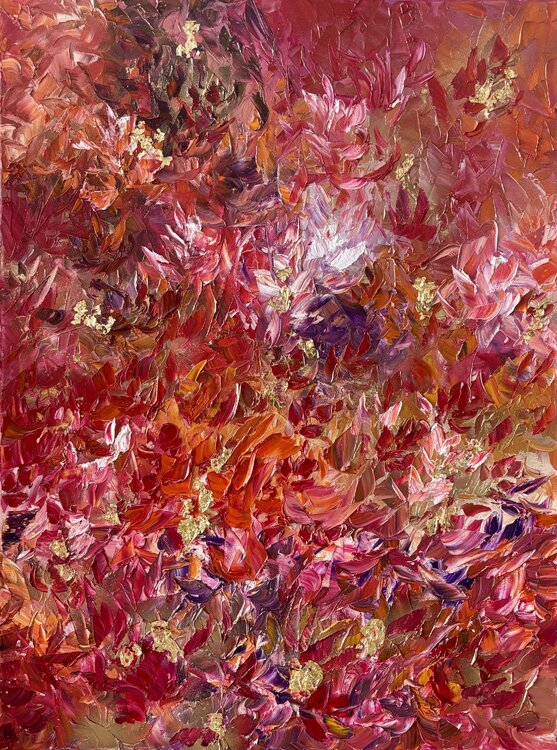 In this vibrant piece, I passionately combined oil, gold leaf and spray paint to express a tumult of emotions through abstraction and expressionism. My brushstrokes conjure a floral tempest, blending fervent reds with whispers of purples and golds, symbolizing the beauty and intensity of raw emotional energy. This artwork is meant to stir the senses and invigorate any space with its dynamic presence.