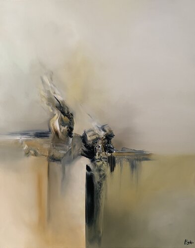 Outside the box - an abstract oil painting using a very somber color palette. The artwork brings about how we should move out of the norm and think outside the box.