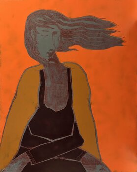 At sunset she stood on the porch and her hair was golden. She was in love.The portraits in my paintings are highly stylized. I like to break the shapes adding a little naïveté. Layering the paint creates texture and density.