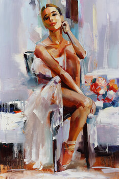 The painting “Bloom sakura” depicts a ballerina in a pink dress, which is likely to be waiting for her dancing part. We catch the girl at the time of the last preparations.