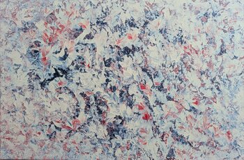 The painting captivates with its fragile complexity. The dark depths and passionate reds in the background are not painted over, but rather embraced… by a delicate, feather-light veil of white. Like mist gently settling over the landscape, this luminous structure softens the contrasts without diminishing their power.