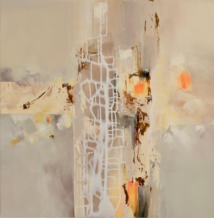 In this artwork, I wanted to capture the gentleness and serenity of evening through warm and soothing hues. The labyrinthine white lines symbolize the inner journey, between light and shadow. This painting invites contemplation, bringing a calm and harmonious energy to your space, like a breath of peace after a hectic day.