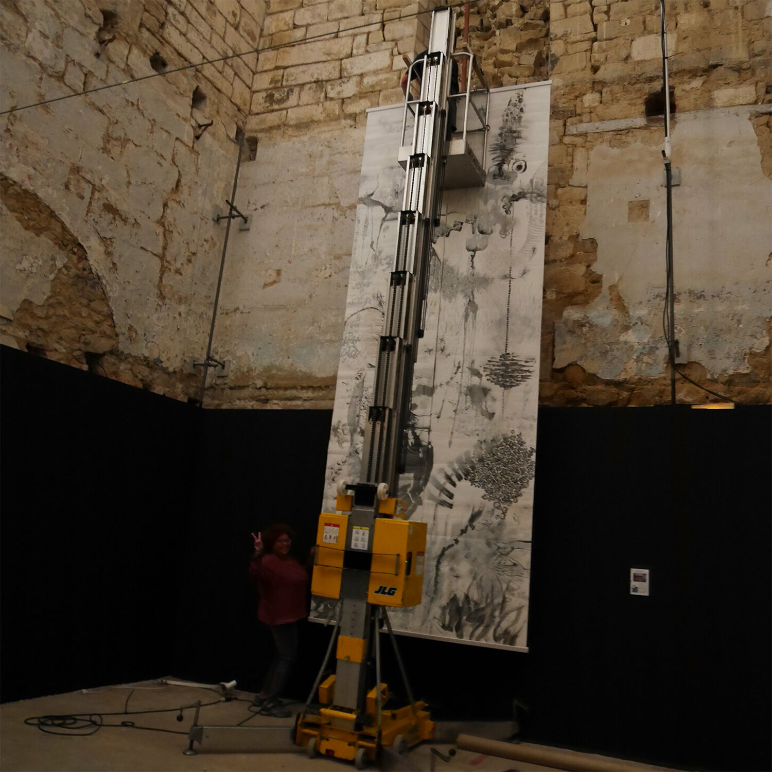 This XXL work is made on 2 free panels of 100x500 cm each in sandpaper, suspended like a kakemono by wooden sticks.