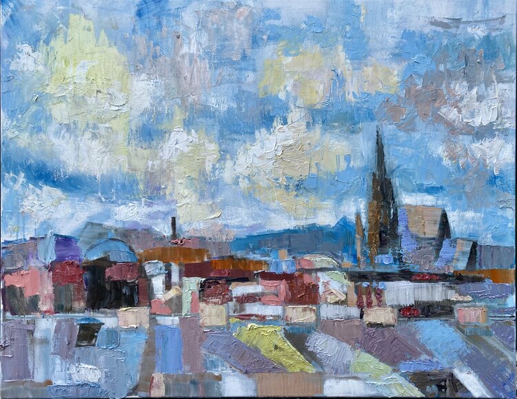 Vladislava Yakovenko is an emerging Slovakian artist whose work focuses on portraits and urban landscapes. Her work seeks to balance flatness and distorted perspective with depth and space. She has contextualized her work within the traditional of suprematism and orphism, two traditions which asserted the absolute self-sufficiency of compositions, texture, and color. Yakovenko paintings expertly balance texture and softness, color, and light and dark.