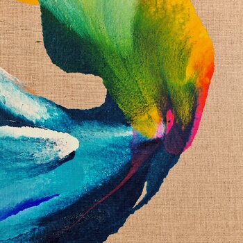 We can witness a rise on the canvases as the paint ascends from the bottom, transitioning from a cold color palette in the left bottom to warm hues in the top right… corner. The employment of raw linen canvases evokes associations with the challenges that hope confronts. The painting brings postivie emotions into a space and is a hope for a better brighter tomorrow.