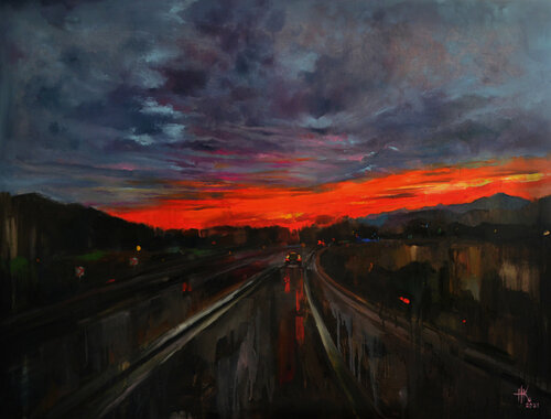 In this piece, I've… merged the raw vitality of expressionism with a hint of abstraction to capture the poignant transition from day to dusk. The vivid oil hues evoke a fervent sky, embracing the weary travelers on their journey home. This painting pulses with the collective heartbeat of lives intertwined in ceaseless motion, each seeking the solace of their haven. It's a visual symphony of the soul's yearning for rest and reflection.