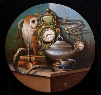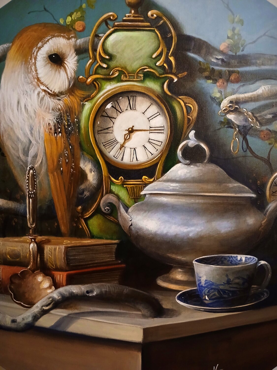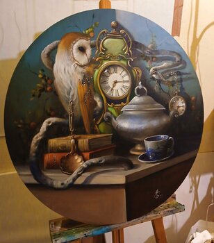 She describes her art as being "pop-surrealist" with roots in conceptual realism. Since her compositions are filled with numerous details, Chigi enjoys using acrylics as they aid in a faster working process. However, she has a lot of experience with oils and loves the techniques associated with the medium.