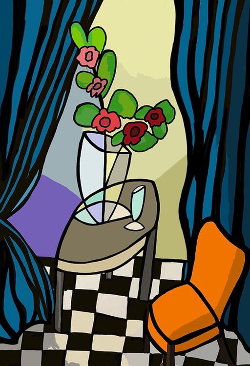 En esta obra, quise capturar una atmósfera íntima y vibrante, donde los colores intensos y las formas limpias crean una alegre armonía entre la naturaleza y el interior. El contraste entre las cortinas oscuras y la silla naranja aporta una calidez inesperada que invita a la contemplación. Es una celebración de la vida sencilla que ilumina el espacio de forma vivaz y poética.