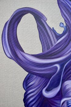 Sobre un fondo tranquilo y neutro, la vibrante forma escultórica de color púrpura se convierte en el único foco de atención, casi suspendida en el espacio.