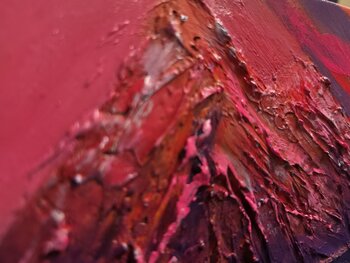 Esta evocadora pintura al óleo explora la intersección entre la fuerza bruta y la quietud absoluta. Con una audaz paleta de violetas intensos y rojos ardientes, el artista emplea una técnica de empaste denso para dotar a la montaña de una presencia táctil y agreste que emerge físicamente del lienzo. En marcado contraste, el primer plano se representa con suaves pinceladas horizontales, creando una superficie de agua que refleja la calidez del atardecer.… Esta obra captura ese fugaz y surrealista instante del crepúsculo en el que la tierra parece brillar desde dentro.