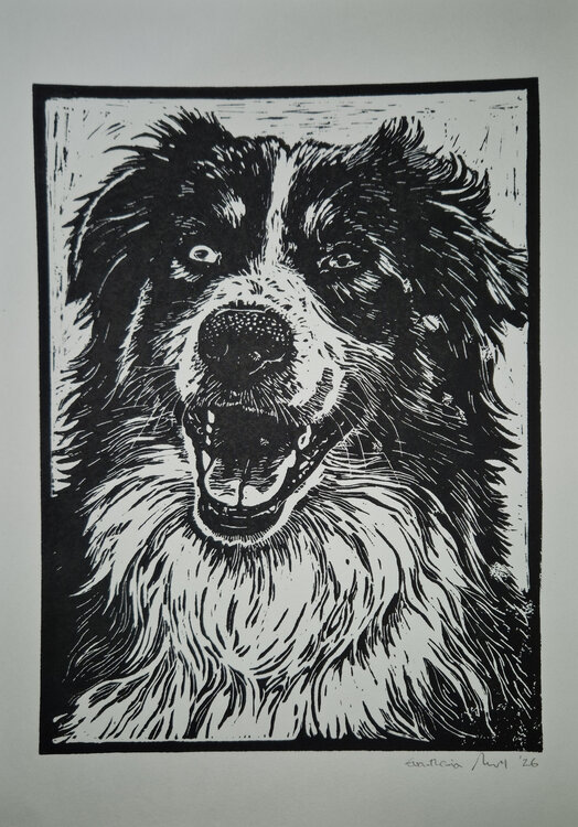 Esta obra es un linograbado en una edición de 5 ejemplares. Representa a mi perro Filou, un pastor australiano. Su pelaje, a veces muy largo, le da una textura que me pareció muy atractiva para una representación gráfica mediante impresión en relieve.