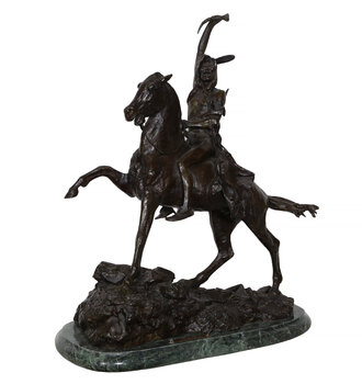 Frederic Remington trabajó principalmente con pintura y escultura, inspirándose en sus raíces estadounidenses para capturar el espíritu del Oeste. Su pincelada dinámica y sus intrincadas formas escultóricas evocan una sensación de movimiento e inmediatez, plasmando en sus figuras —vaqueros, indígenas americanos, caballería— un realismo vívido y una narrativa heroica. A través de su arte, evoca la tenacidad, la aventura y la conmovedora nostalgia de una frontera desaparecida, despertando una profunda admiración entre los espectadores.