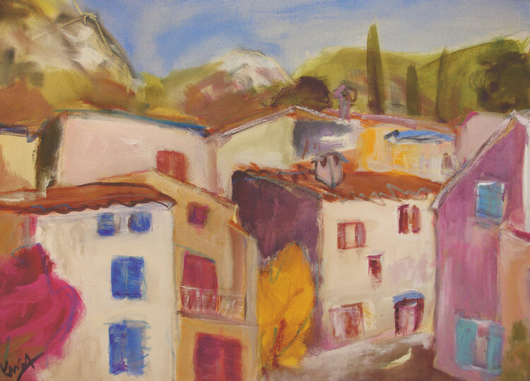 Colores cálidos, cadenas de colinas a lo lejos, paredes de casas iluminadas por el sol con techos de arcilla