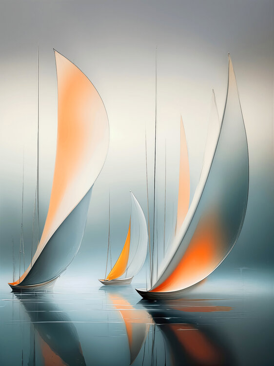 Esta obra interpreta el motivo del velero con un lenguaje visual abstracto, casi escultórico. Las velas se liberan de cualquier representación realista y aparecen como formas flotantes de luz, superficie y movimiento. Los degradados de color entre tonos azules fríos y naranjas cálidos crean una atmósfera de serena elegancia.