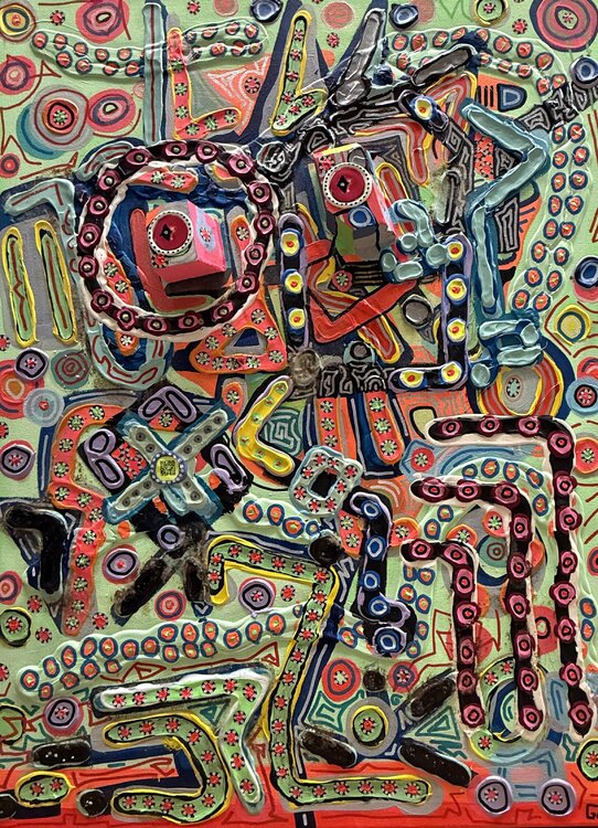 En esta obra, he combinado mi fascinación por los colores vibrantes y las formas abstractas para crear una energía explosiva. La fusión del arte aborigen con el Pop Art refleja la diversidad de las emociones humanas. Las líneas y patrones audaces invitan al espectador a descubrir las historias que se esconden tras las figuras y aportan dinamismo y alegría a cualquier espacio. Es una oda a la creatividad y la expresión.