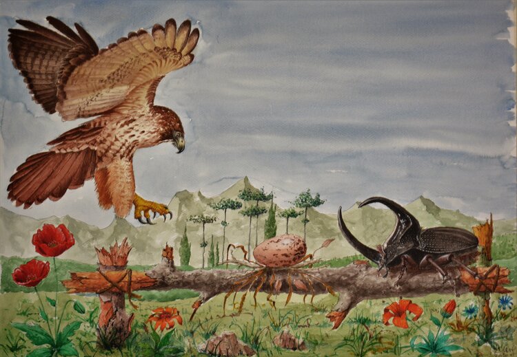 En este trabajo capté la esencia de la irrealidad y la audacia. Usando gouache sobre papel, pinté un mundo donde la vida silvestre revela una combatividad casi humana. Un majestuoso halcón se eleva sobre dos escarabajos titánicos enzarzados en un feroz duelo, simbolizando la lucha perpetua por la supervivencia y la supremacía. Los colores terrosos y los elementos surrealistas invitan a la reflexión sobre la naturaleza y sus extraordinarias criaturas.… Cada mirada a esta escena transporta al observador a un relato épico donde el reino animal y la imaginación se fusionan magníficamente.