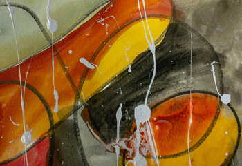 Esta colorida pintura abstracta, "Respiradores de fuego", fue creada con acuarelas, marcadores y acrílicos sobre papel. Sus colores vivos transmiten una sensación de peligro.