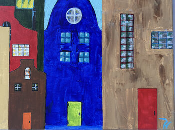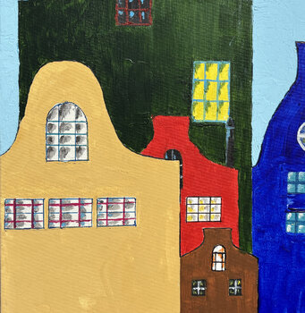 Muestra una serie de edificios inspirados en Ámsterdam, cada uno con colores únicos y adornado con ventanas extravagantes. La composición está dominada por tonos intensos: verdes intensos, rojos vibrantes, azules intensos y cálidos tonos tierra, creando un vibrante paisaje urbano contra un cielo azul sereno. Las siluetas ondulantes de los edificios y las ventanas alegres y desiguales contribuyen a la esencia caprichosa de la pintura. Cada estructura,… con su forma y paleta distintivas, llama la atención; sin embargo, en conjunto, forman una escena armoniosa y equilibrada. El uso de la textura por parte del artista añade profundidad, invitando al espectador a explorar cada detalle.