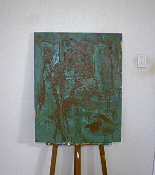 Esta obra presenta un denso campo de gestos verdes y marrones, que conforman un terreno donde la materia se asienta, se endurece y persiste en silencio. La superficie se asemeja a un suelo compactado: estratificado, resistente, marcado por huellas que registran la presión en lugar de borrarla.