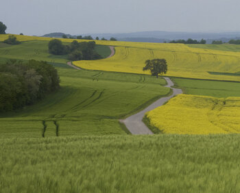 Un camino estrecho desciende suavemente entre campos en plena floración, atrayendo la mirada hacia un paisaje que se despliega en capas silenciosas. El amarillo de la colza contrasta con los verdes suaves de los campos circundantes, mientras que una lejana arboleda mantiene el horizonte en una línea serena y constante. Arriba, el cielo se tiñe de tonos apagados, sugiriendo un instante suspendido entre la quietud y el cambio.