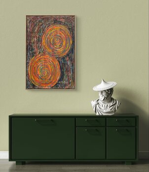 En esta pintura, quise capturar la vibrante energía de dos círculos entrelazados, símbolo de conexión y continuidad. El uso de acrílicos y pasteles al óleo crea una textura dinámica que invita a sumergirse en los colores cálidos e intensos. Esta obra transmite movimiento y profundidad, aportando una sensación de equilibrio y pasión a tu hogar.