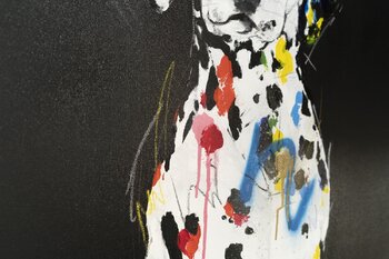 Al crear esta obra, volqué mi pasión en la fusión entre la abstracción y el realismo. Utilicé acrílicos y aerosoles para jugar con las formas y los colores, capturando el espíritu y la emotividad de un noble dálmata. Cada pincelada y salpicadura representa un complejo paisaje emocional,… vibrante y evocador a la vez, que invita al espectador a detenerse y reflexionar. Esta pintura no solo enriquece visualmente un espacio, sino que también añade una profunda dimensión emocional, inspirando la contemplación y el diálogo.