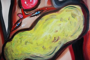 Esta obra de arte fusiona la estética retro de las pin-ups con el surrealismo pop moderno, explorando temas como el deseo, la indulgencia y la expresión corporal a través de una perspectiva caprichosa, casi caricaturesca.