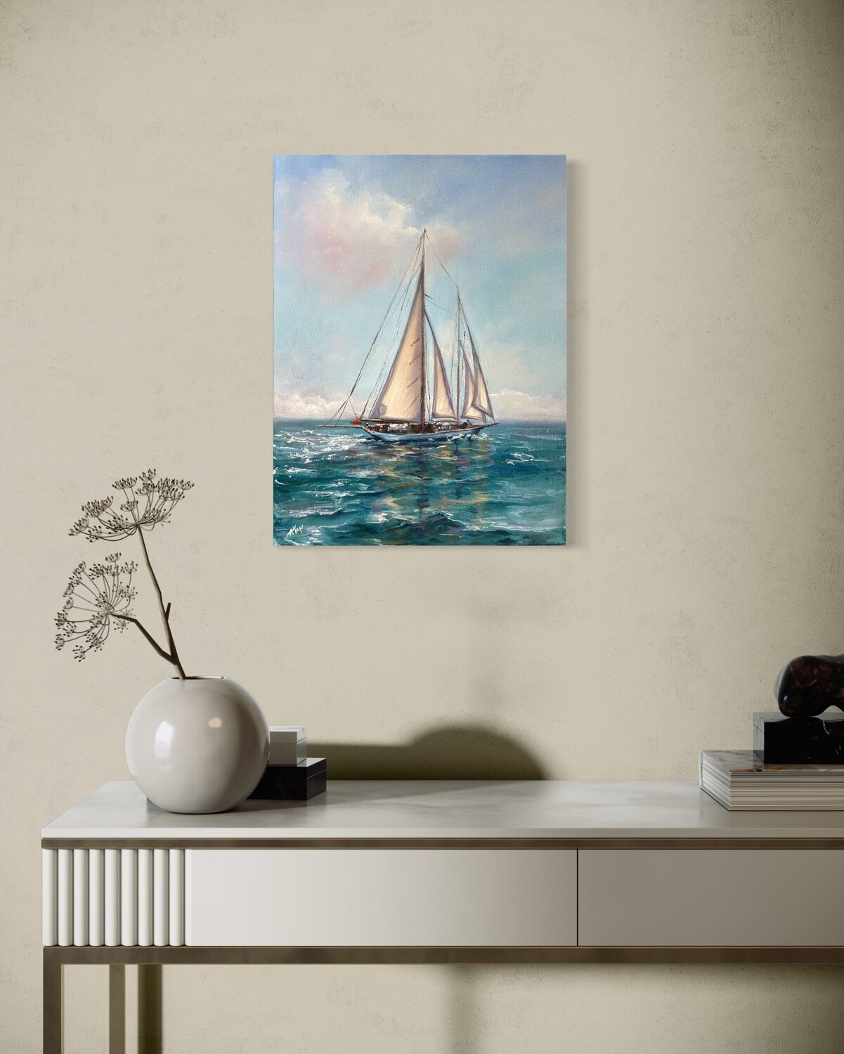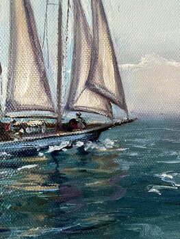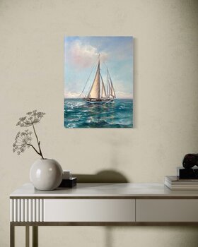 Dans ce tableau, j'ai capturé la beauté sereine d'un voilier sillonnant les eaux scintillantes sous un ciel doux. À l'huile, j'ai mêlé impressionnisme et réalisme pour évoquer un sentiment d'aventure sereine et de liberté. Le jeu de lumière sur les voiles et la mer invite à ressentir la douce brise et les possibilités infinies, apportant tranquillité et inspiration à chaque espace.
