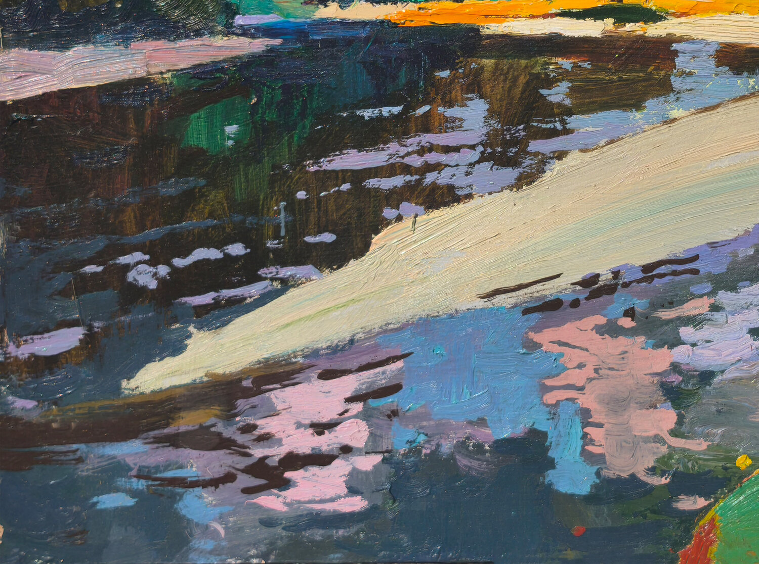 Dans cette huile sur carton, j'ai fusionné le réalisme avec des touches d'expressionnisme et d'impressionnisme pour capturer la beauté éphémère d'un paysage fluvial. Mes coups de pinceau portent le dynamisme de la nature, tandis que la palette vive reflète une symphonie d'émotions. C'est une pièce qui évoque l'esprit serein mais revigorant des vues naturelles, promettant d'insuffler à votre espace une énergie tranquille mais exaltante.