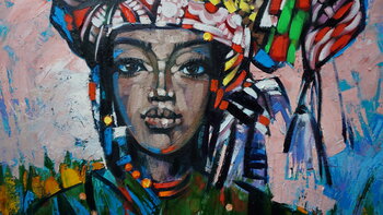Une belle fleur exotique noire. Orchidée noire. Fille de beauté exotique noire. Vous la regardez et cela vous coupe le souffle. Je veux rester debout et regarder. Les fleurs se fanent rapidement, même celles pour lesquelles les conditions idéales sont créées. La beauté des femmes s'estompe plus lentement que la beauté d'une fleur, mais elle est tout aussi fugace et fuyante. L'une des rares façons d'immortaliser la beauté d'une femme est de la capturer… sur toile. Pour que beaucoup puissent l'admirer. La solution décorative de la coiffe crée des rythmes répétitifs et est envoûtante. Un regard calme, des lèvres charnues, des sourcils tombants, le ciel, des nuages, la beauté insaisissable d'une fleur exotique. Peinture idéale pour les intérieurs modernes. Collection Afrique-or noir.