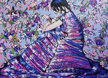 De la collection Crazy Spring. Fille de printemps indécise assise contre un ciel plein de fleurs printanières. Couleurs pures et ouvertes. Rose fuchsia, outremer, bleu clair, vert délicat. Sa robe ressemble à des ruisseaux printaniers, coulant de haut en bas. Encore un peu et le printemps prendra tout son sens, son indécision fondra et disparaîtra comme neige. Tableau moderne pour un intérieur moderne. Pop Art.